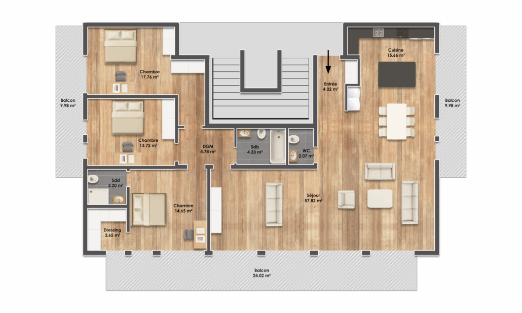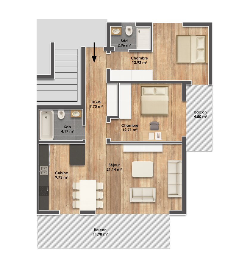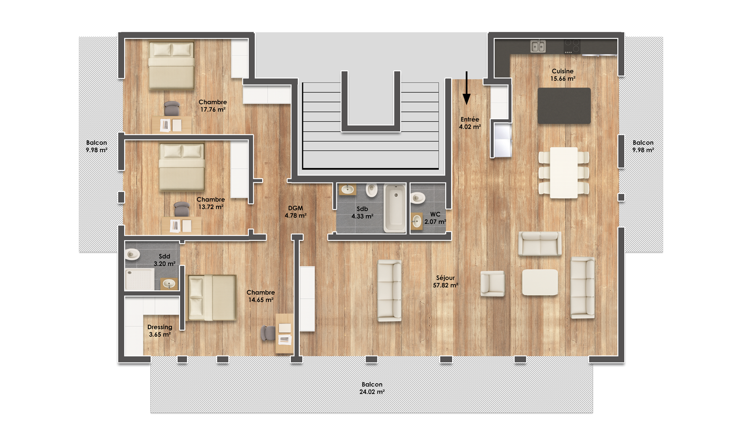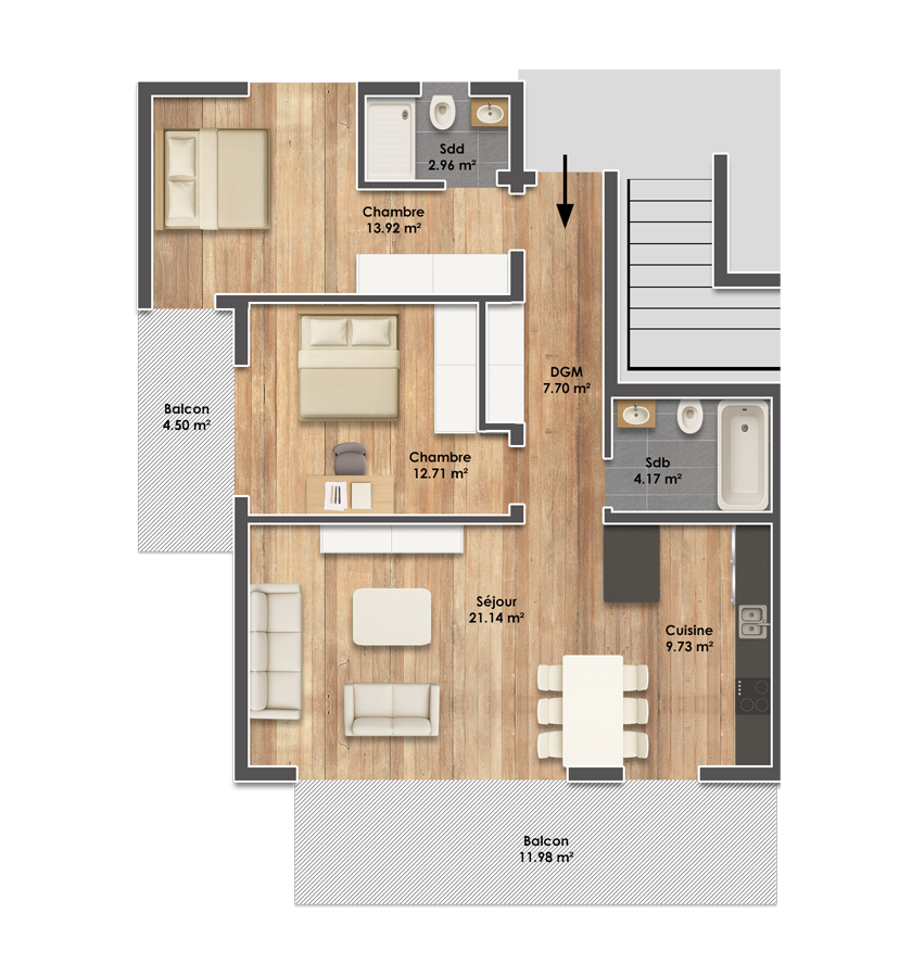 Chaque appartement bénéficie de volumes généreux, de grandes baies vitrées, de balcons spacieux et d’un chauffage au sol alimenté par pompe à chaleur.